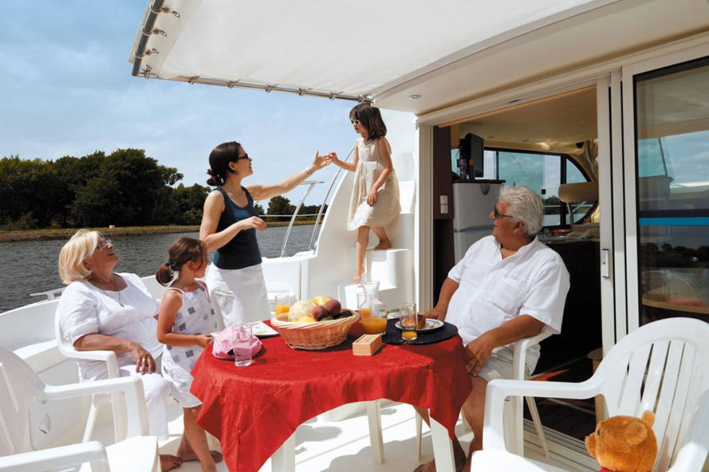 Nos bateaux sont conçus pour garantir la sécurité de tous, y compris des enfants et des petits-enfants. Reconnus pour leur maniabilité et leur facilité d'accès, les modèles comme les gammes Fly, Sedan et Estivale disposent d'une terrasse de plain-pied, idéale pour les plus jeunes, sans escalier. De plus, tous nos bateaux sont équipés de balcons double filière et de mains courantes, garantissant une sécurité maximale autour du bateau. La terrasse arrière est protégée par un balcon de 1 mètre de haut, et depuis le séjour ou le poste de pilotage, vous pouvez facilement surveiller les enfants. Toutefois, étant donné les risques liés à l’eau, il est recommandé que les enfants portent un gilet de sauvetage ou des brassards pour les tout-petits, plus confortables par temps chaud. Plus particulièrement lors des manoeuvres telles que l'amarrage ou le passage d'écluse. Nous proposons des gilets taille standard enfant sur nos bases.