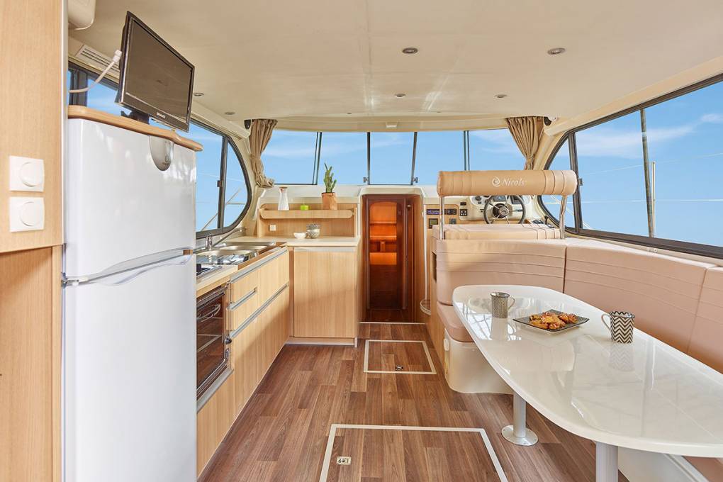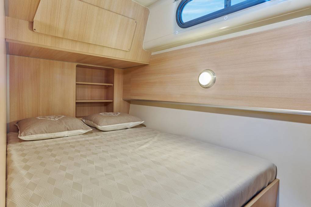 Suggestion : si les bateaux Nicols ne bénéficient pas du label "accueil handicap", certains de nos modèles sont plus appropriés que d'autres pour accueillir les personnes à mobilité réduite. Ainsi, les gammes Estivale et Fly sont accessibles par l'arrière, via un large portillon. En amarrant le bateau par la poupe, il est donc aisé de passer du ponton à la terrasse arrière en fauteuil roulant. Cette terrasse arrière est de plain pied avec le séjour, accessible via une large baie vitrée : là encore, un accès possible pour un fauteuil. Le séjour offre l'espace cuisine, l'espace déjeuner, et une banquette convertible en lit double. Le couchage est donc possible dans cet espace de vie ; à noter toutefois que pour rejoindre les toilettes, douches, et autres cabines de nuit, il faut emprunter un couloir d'enivron 60 cm de large et accessible généralement via 2 à 3 marches : l'idéal est donc que la personne à mobilité réduite puisse à minima se lever, seule ou accompagnée, afin d'effectuer les quelques pas nécessaires pour rejoindre les sanitaires.