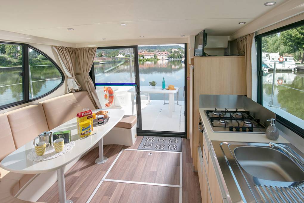 Les bateaux fluviaux sans permis offrent un confort comparable à celui d’un mobil-home ou d’un camping-car. Leur design spécifique, avec un fond plat, permet d’optimiser l’aménagement intérieur, créant des espaces fonctionnels tels que des chambres, des salles de bain et une cuisine équipée. De plus, tous nos modèles (suaf le Riviera 920) sont équipés d’une terrasse extérieure, idéale pour manger en plein air. Un double pilotage (intérieur et extérieur) permet également de profiter du soleil tout en naviguant. Ces aménagements garantissent un confort optimal pour une croisière agréable et détendue.