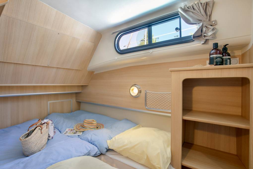 Suggestion : si les bateaux Nicols ne bénéficient pas du label "accueil handicap", certains de nos modèles sont plus appropriés que d'autres pour accueillir les personnes à mobilité réduite. Ainsi, les gammes Estivale et Fly sont accessibles par l'arrière, via un large portillon. En amarrant le bateau par la poupe, il est donc aisé de passer du ponton à la terrasse arrière en fauteuil roulant. Cette terrasse arrière est de plain pied avec le séjour, accessible via une large baie vitrée : là encore, un accès possible pour un fauteuil. Le séjour offre l'espace cuisine, l'espace déjeuner, et une banquette convertible en lit double. Le couchage est donc possible dans cet espace de vie ; à noter toutefois que pour rejoindre les toilettes, douches, et autres cabines de nuit, il faut emprunter un couloir d'enivron 60 cm de large et accessible généralement via 2 à 3 marches : l'idéal est donc que la personne à mobilité réduite puisse à minima se lever, seule ou accompagnée, afin d'effectuer les quelques pas nécessaires pour rejoindre les sanitaires.
