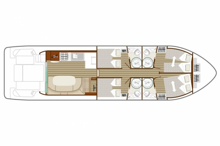En embarquant à bord de l'Octo Fly, vous profiterez de notre bateau le plus confortable. L'intérieur du bateau offre une salle de bain par cabine et la cuisine est équipée d'un lave-vaisselle et d'un micro-ondes pour encore plus de confort au quotidien. Vous pourrez prendre de la hauteur en profitantn d'un pont supérieur composé d'un espace déjeuner, d'une plancha, d'un bimini, de matelas de pont et d'un second poste de pilotage.