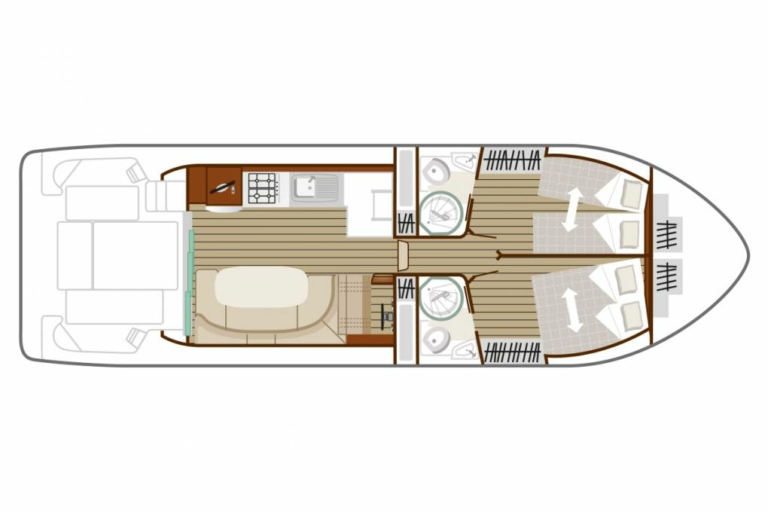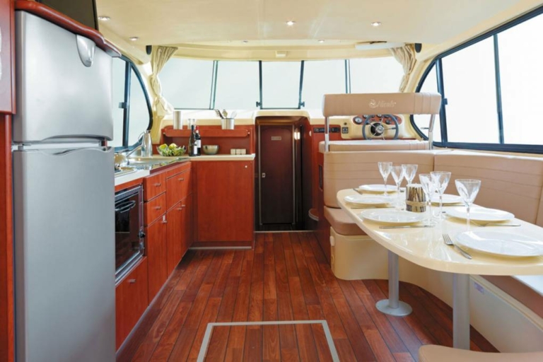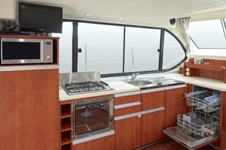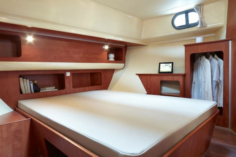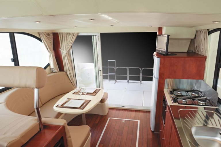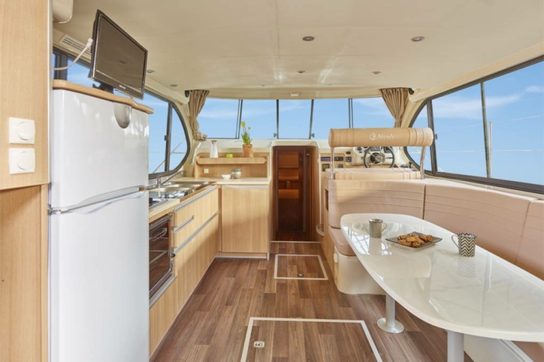 En embarquant à bord du Quattro Fly C, vous profiterez de notre bateau le plus confortable. L'intérieur du bateau offre une salle de bain par cabine et la cuisine est équipée d'un lave-vaisselle et d'un micro-ondes pour encore plus de confort au quotidien. Vous pourrez prendre de la hauteur en profitantn d'un pont supérieur composé d'un espace déjeuner, d'une plancha, d'un bimini, de matelas de pont et d'un second poste de pilotage.